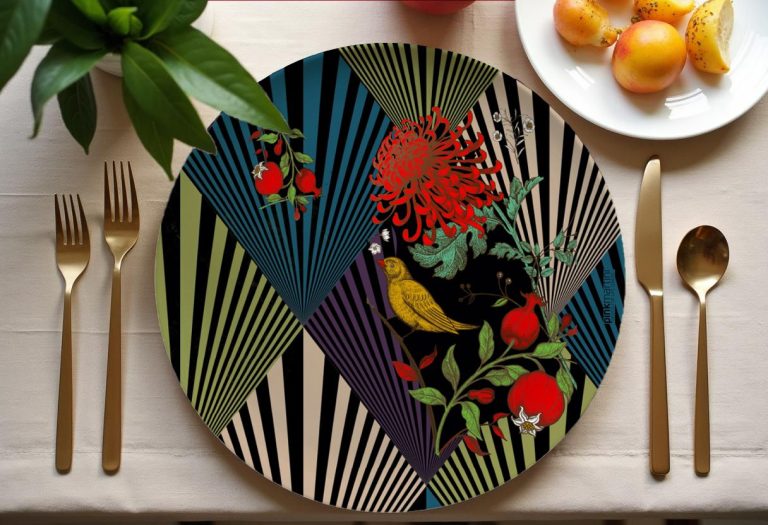 Tovaglietta americana rotonda in polivinile con grafiche originali PinkMartini. Resistente, lavabile e ignifuga. Disponibile anche su misura e in formato rettangolare.