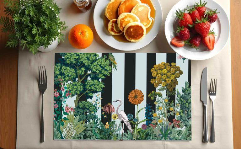 Tovaglietta americana rotonda in polivinile con grafiche originali PinkMartini. Resistente, lavabile e ignifuga. Disponibile anche su misura e in formato rettangolare.