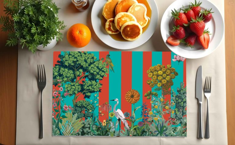 Tovaglietta americana rotonda in polivinile con grafiche originali PinkMartini. Resistente, lavabile e ignifuga. Disponibile anche su misura e in formato rettangolare.