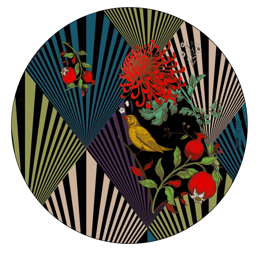 Tovaglietta americana rotonda in polivinile con grafiche originali PinkMartini. Resistente, lavabile e ignifuga. Disponibile anche su misura e in formato rettangolare.